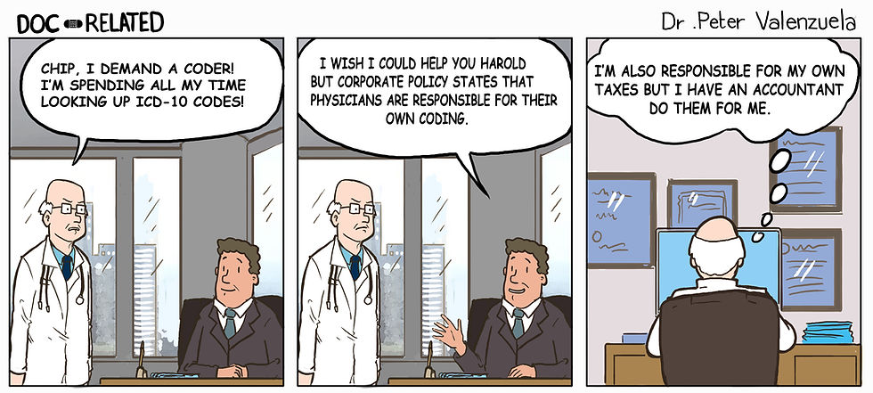 Docs as CodersPeter Valenzuela, MD, MBADec 5, 20161 min readUpdated: Sep 10, 2023 Dr. Katz demands a coder to help with the 68,000 ICD-10 codes